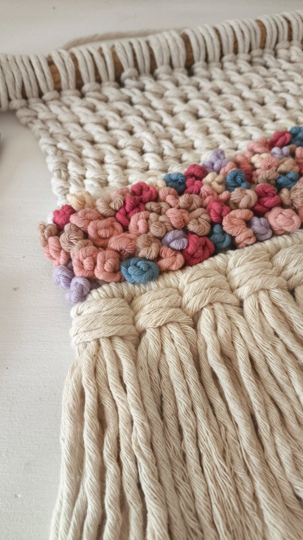 Tapiz tejido en hilo de algodón natural con la técnica de macramé y telar.