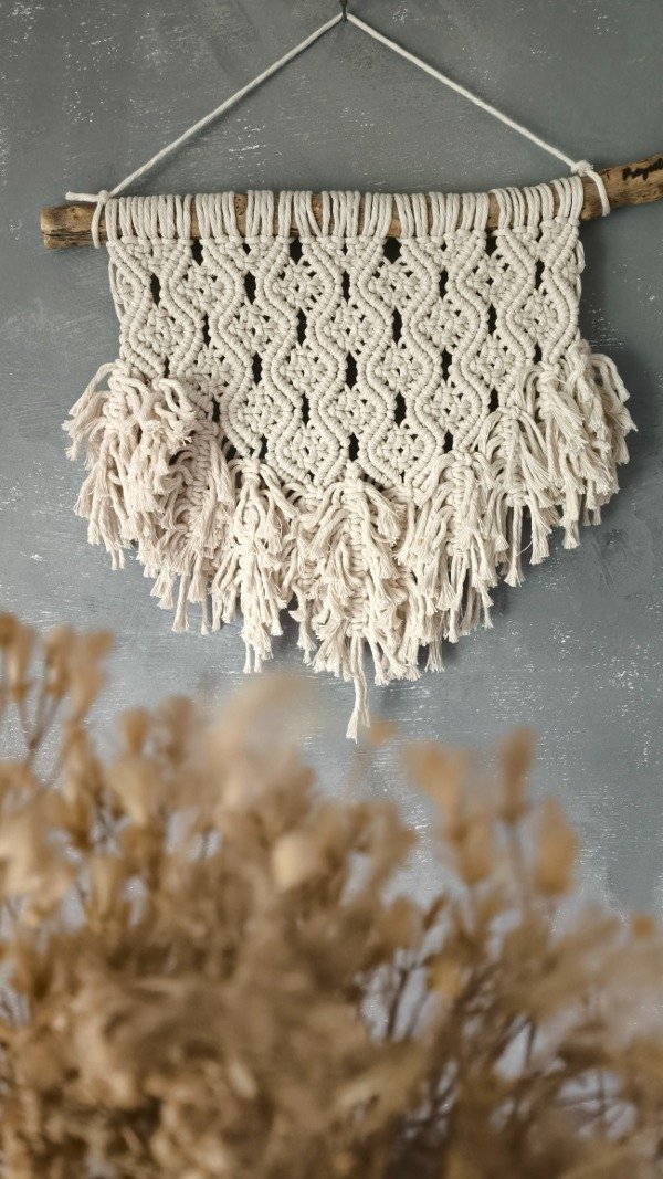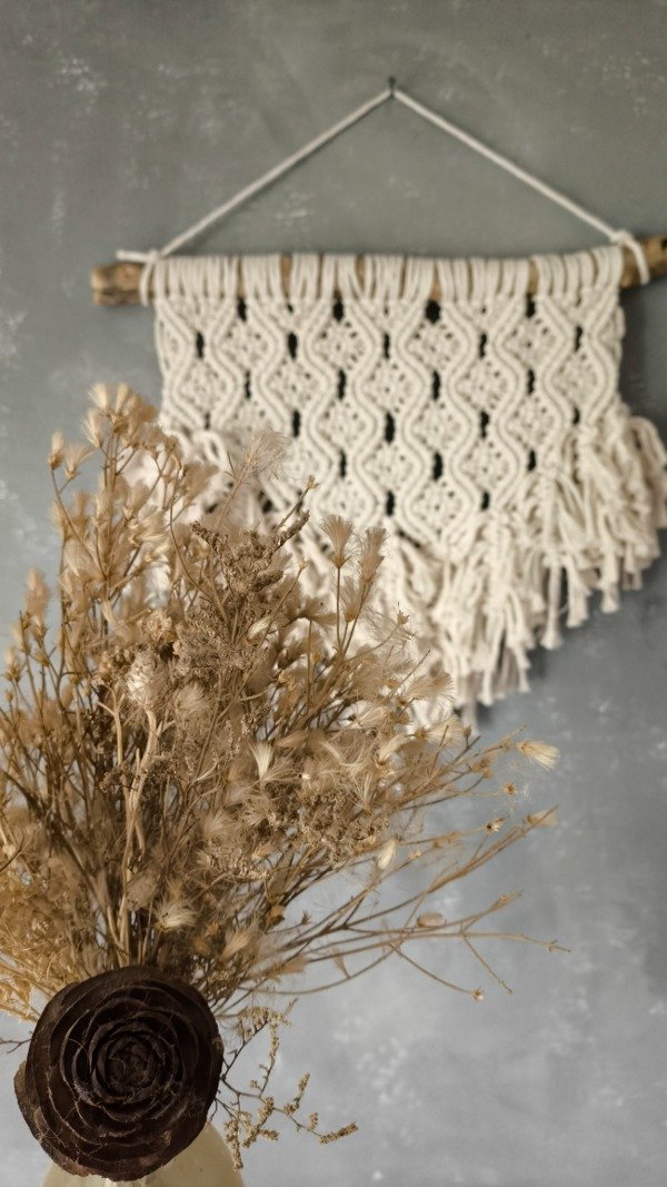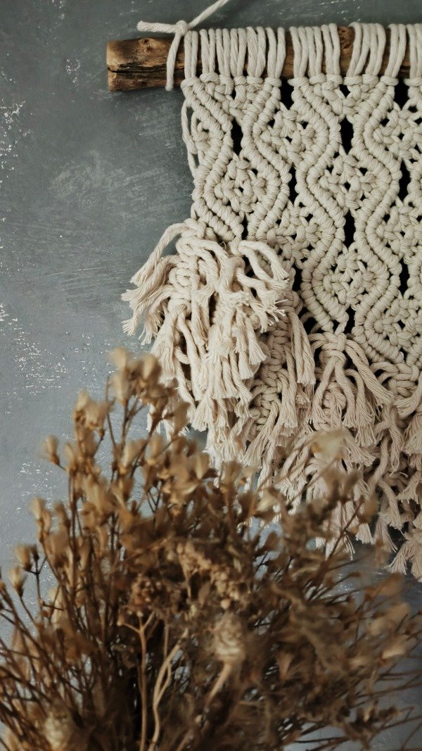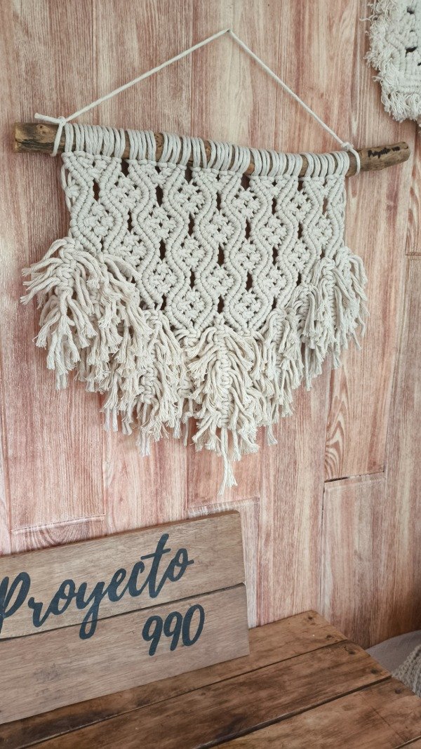 Tapiz tejido en hilo de algodón grueso color natural sobre rama lijada y laqueada.