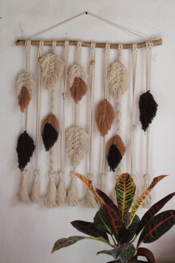 Tapiz realizado en hilo de algodon color natural y de color. Soporte de 70 cm de largo.