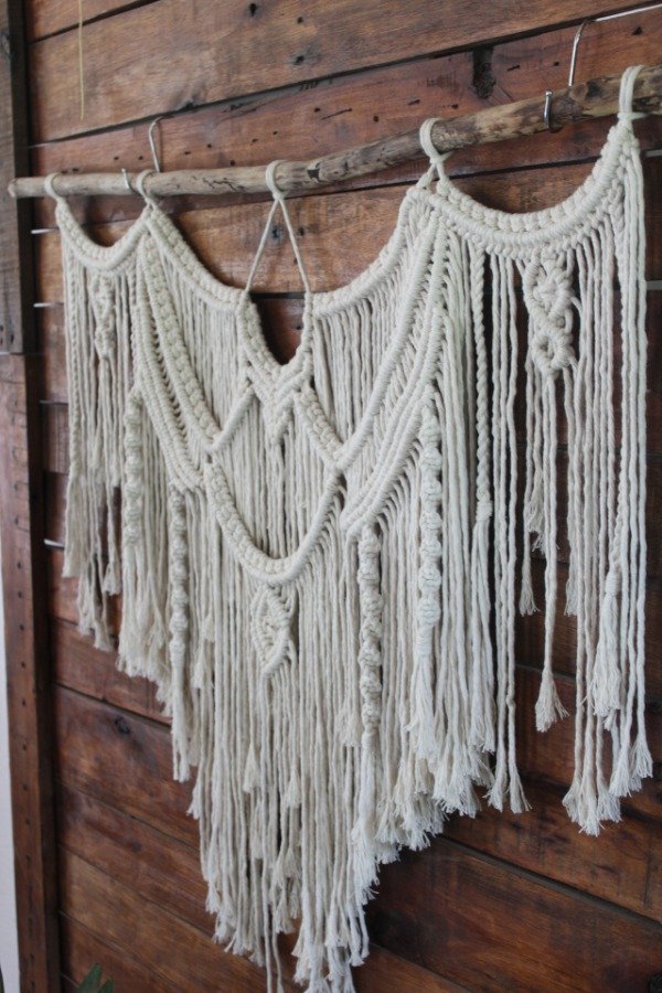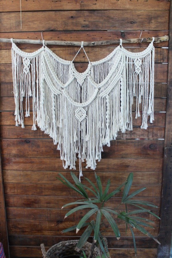 Tapiz realizado en hilo de algodon color natural tejido en macrame sobre una base de rama rústica.