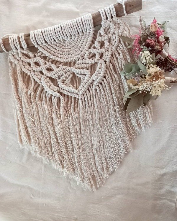 Tapiz realizado en macrame en hilo de algodon color natural sobre soporte natural.